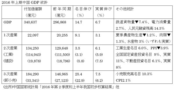 ②GDP統計以外のマクロ指標の動きは一様ではない。例えば2016年上期GDP統計では、2次産業工業部門の付加価値額の対前年同期比は名目3.5%、実質6.1%だが、別途工業生産統計では名目6%、仮に工業製品出荷価格指数(PPI)▼3.9%をデフレーターにすると、実質伸びは9.9%とGDP統計の1.5倍以上になる。GDP統計2次産業建設部門名目5.8%増、実質7.5%増に対し、別途固定資産投資、不動産投資統計では各々名目9%、6.1%、実質11%、8%だ。GDP統計3次産業卸小売部門伸びは名目22.9%、実質6.2%、別途小売販売高統計では名目10.3%だが、仮にCPI対前年同期比2.1%をデフレーターにすると、実質は8.2%とやはりGDP統計を上回る。