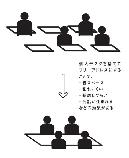 それから、個人デスクがあると、ついついそこに居ついてしまいます。特に、営業や企画などの仕事の場合には、外に出ていって人と接することが求められるはずですが、デスクの居心地の良さが、腰を重くする要因になってしまいます。