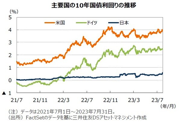 米連邦準備制度理事会(FRB)は、7月の米連邦公開市場委員会(FOMC)で、フェデラルファンド(FF)金利の誘導目標を5.00~5.25%から5.25~5.50%に0.25%引き上げました。パウエル議長は記者会見で、今後の金融政策判断は「データ次第」と従来通りの姿勢を示しました。ECBは7月の理事会で、9会合連続となる利上げを決めました。利上げ幅は3会合連続で0.25%でした。ラガルド総裁は記者会見で、今後の利上げペースは「データ次第」とし、9月の利上げ見送りの可能性に言及しました。日銀は、7月の金融政策決定会合で、YCCの運用を柔軟化しました。長期金利の上限について0.5%を「目途」として、0.5%を超える金利上昇を容認しつつ、事実上1.0%の上限を設けました。大規模な金融緩和策の枠組みは維持しました。