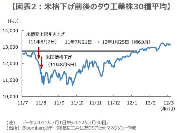 格下げを受けて、ダウ工業株30種平均は2011年7月21日の直近高値から10月3日まで16.3%下落し、7月21日の水準を回復したのは約半年後の2012年1月25日でした(図表2)。なお、ダウ平均が下落した2011年7月21日から10月3日までの期間、米10年国債利回りは1.26%の低下幅となり、ドル円は1円67銭、ドル安・円高が進行しました(ニューヨーク市場終値ベース)。