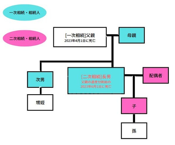 数次相続とは、法定相続人が相続承認後、相続に関する手続きが終了しないうちに、更にその人が亡くなり、複数の相続が発生してしまう状態を指します。具体的には下図のようなケースが数次相続です。