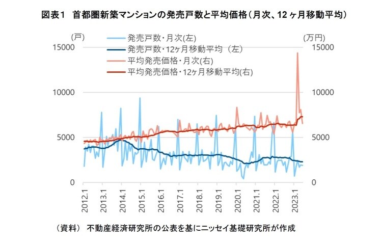傾向を見るために発売価格と発売戸数それぞれを直近12ヶ月の移動平均に変換してみると、2023年6月の価格は7,924万円(前年同月比+12.6%、2013年同月比+57.5%)、発売戸数は2,280戸(▲17.3%、▲44.3%)となった(図表1)。