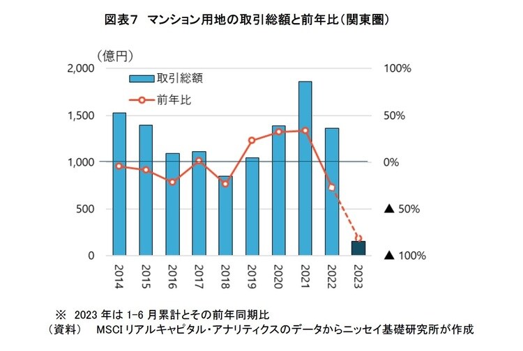 MSCIリアルキャピタル・アナリティクスによると、2023年7月21日までに判明した関東圏のマンション用地の取得額は約158億円1、2023年1-6月累計の前年同期比は▲81.3%とマイナスであった(図表7)。