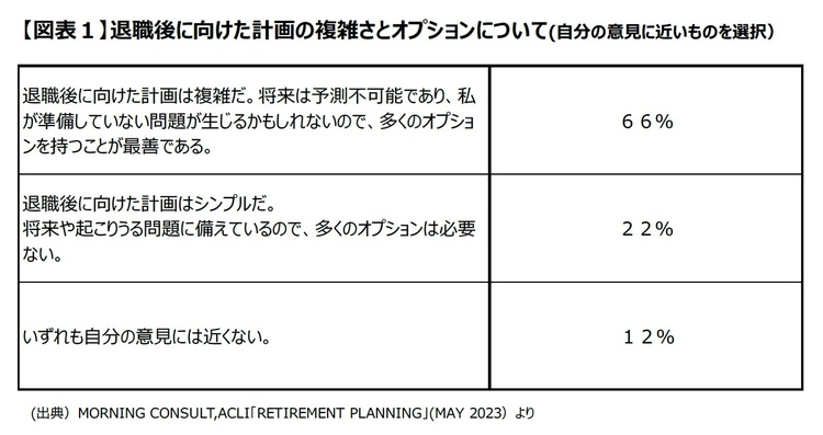 なお、回答者の3分の2(66%)が、退職後に向けた資金計画は複雑であり、将来は何が起きるかわからないので、多くの選択肢を持つことがベストである、と考えている(図表1)。