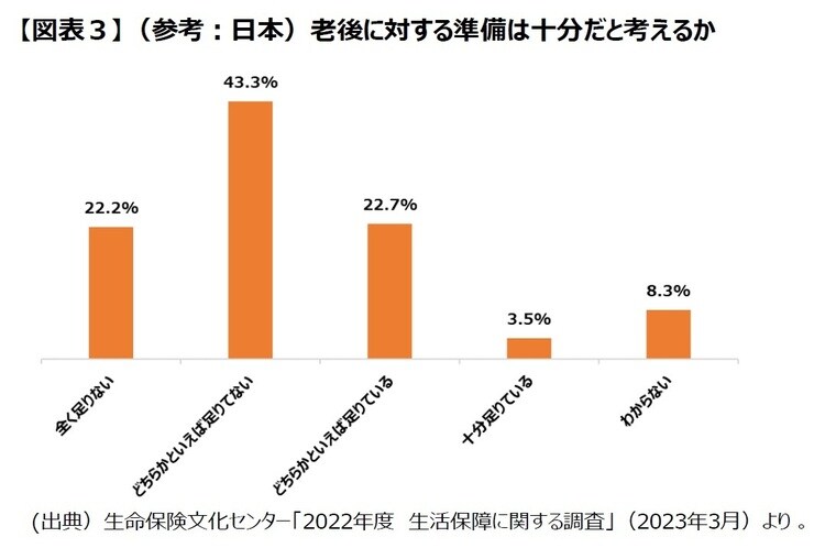一方、生命保険文化センター「2022(令和4)年度 生活保障に関する調査」(2023(令和5)年3月)によれば、日本の消費者の「老後保障に対する充足感」(現在の備えに公的年金や退職金などをあわせると老後に対する準備は十分だと考えるか。)についての調査結果は、「充足感なし」65.5%(「全く足りない」、「どちらかといえば足りてない」の合計)、「充足感あり」26.2%(「どちらかといえば足りている」、「十分足りている」の合計)、「わからない」8.3%となっている(図表3)。