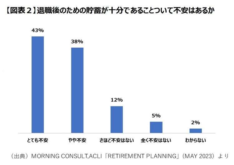 当調査によれば、「退職後のための貯蓄が十分であることについて不安を感じるか」との質問に対し、回答者の81%(「とても不安」(43%)、「やや不安」(38%))が、不安を感じている(図表2)。