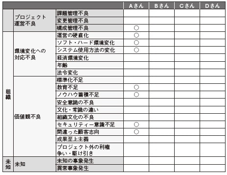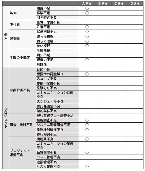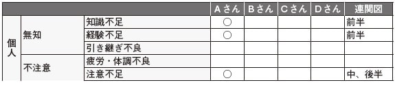 ステップ2としてグループ作業の場合は一人ひとりが作業したものを1つの表にまとめていく。今回は、例として4名がグループ作業を行ったイメージ図を記載している。筆者の作業結果をAさんの列に記入した。失敗学会の思想として、原因の究明が大切であり、「誰が原因か」といった、特定の個人の名前は必要ないため、ABCDなどの符号で個人が特定できないように配慮する。集約したイメージ図は下記のようになる。