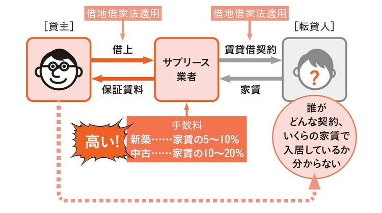 サブリース業者が貸主(物件の所有者)から住戸を借り上げ、転貸人(入居者)と賃貸借契約を結びます。入居者はサブリース業者に家賃を支払い、その中から手数料を引いた額が貸主に保証賃料として支払われる仕組みです([図表1]参照)。