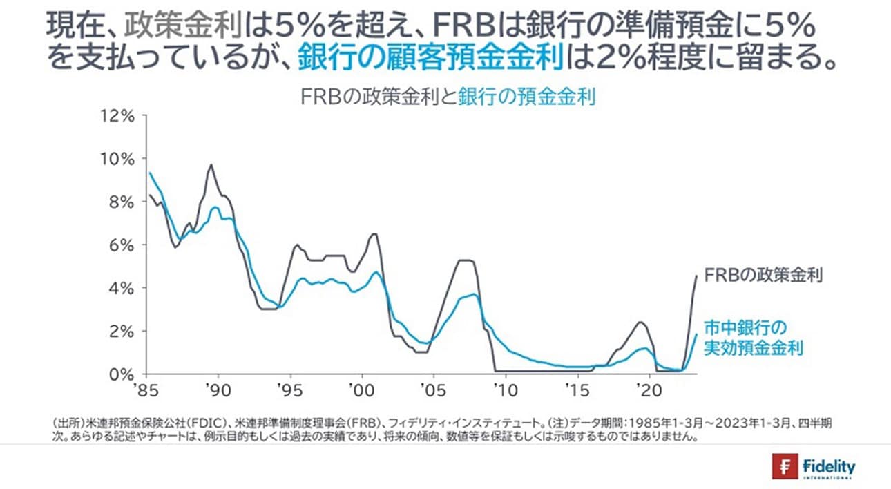 [図表1]に示すとおり、現在の米国の政策金利は5%を超えますが、米国の預金金利は2%程度です。