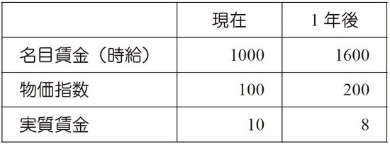 1年後の実質賃金が上がるか下がるかは、物価指数がどのように推移するのかによります。物価指数が100から80に下がれば、実質賃金は10から20(=1600÷80)へと大きく上昇します。つまり、インフレーションが起きると実質賃金は下がり、デフレーションが起きると実質賃金が上がります。