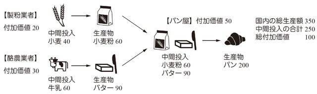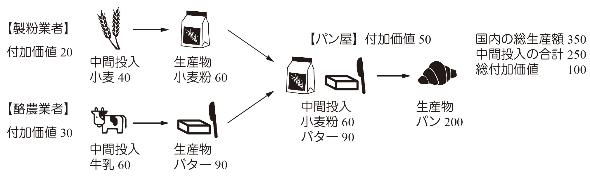 この例では、生産額の合計は350になります。パンの生産額200のうち150は製粉業者や酪農業者の生産額としてすでにカウントされており、生産額をカウントすると小麦粉やバターは二重計算されることになります。産出から原材料の中間投入を引いた付加価値を使えば二重計算の心配はなくなります。国全体では、