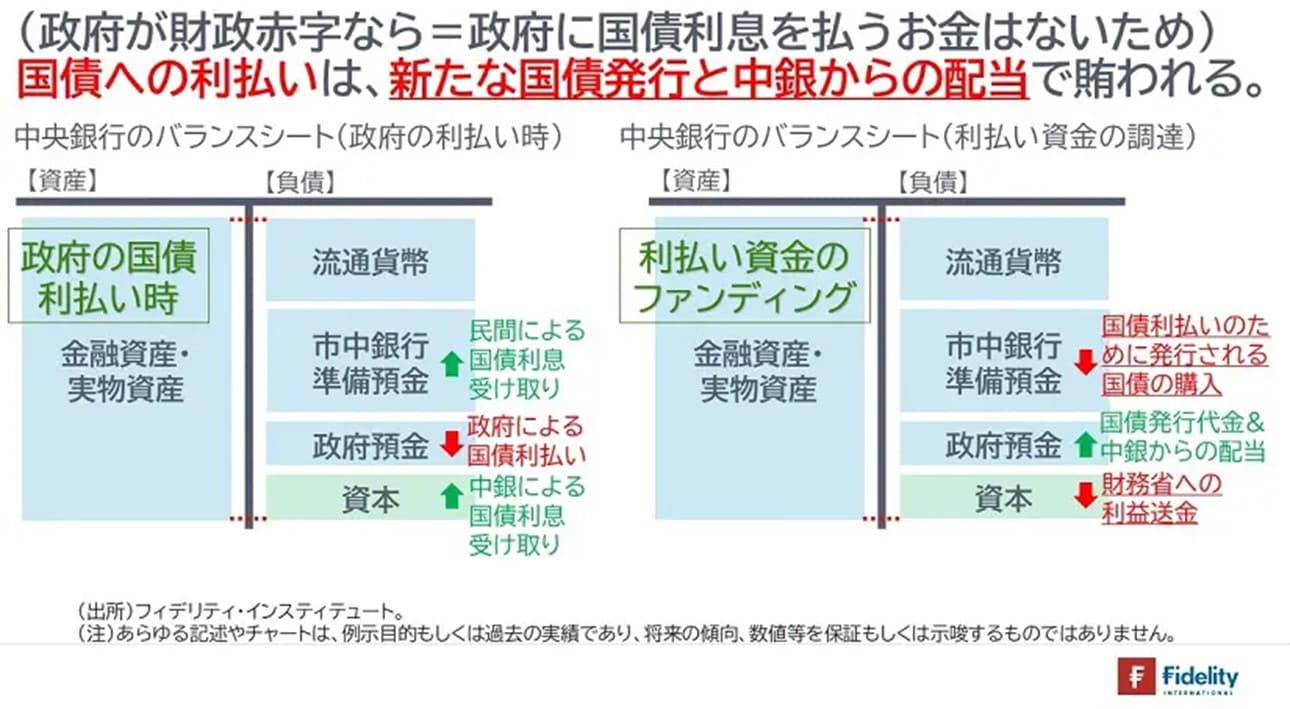 よって、政府は、利払いにあたり、利払い分の金額を、新たな国債発行と中銀からの利益送金(=中銀が受け取った国債利息の返金)というかたちで用立てします。すなわち、多少の時間差はあれど、準備預金残高(=マネーの一部)や政府預金残高、中銀の資本勘定は「行って来い」になります。