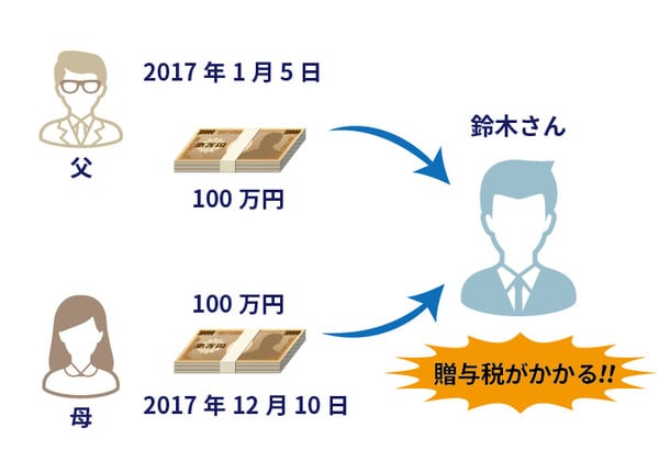 たとえば、上図の鈴木さんが、1月5日に父親から100万円、12月10日に母親から100万円をもらったとします。すると、1年間の間に鈴木さんがタダでもらった財産の合計額は200万円となり、110万円を超えるので贈与税が課せられることになります。