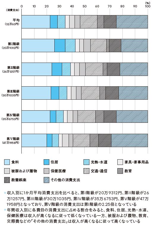 総務省の「家計調査」にある消費支出のデータからも興味深い事実がわかります。[図表]のグラフでは、すべての世帯を収入の低い方から第Ⅰ・第Ⅱ・第Ⅲ・第Ⅳ・第Ⅴ階級に分けて、生活費の実態を調査しています。