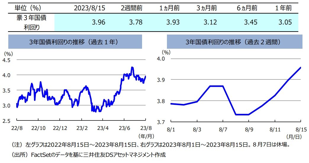 ここ2週間の豪州3年国債利回りは、上昇しました。8月8日に発表された豪州の消費者信頼感指数が前月より低下したことなどから、豪州3年国債利回りが低下(債券価格は上昇)する局面はありましたが、米国で発表された7月の雇用統計や物価統計などの結果により米連邦準備制度理事会(FRB)の利上げ観測が強まったため、米国国債の利回りが上昇し、連れて豪州3年国債利回りも上昇しました。