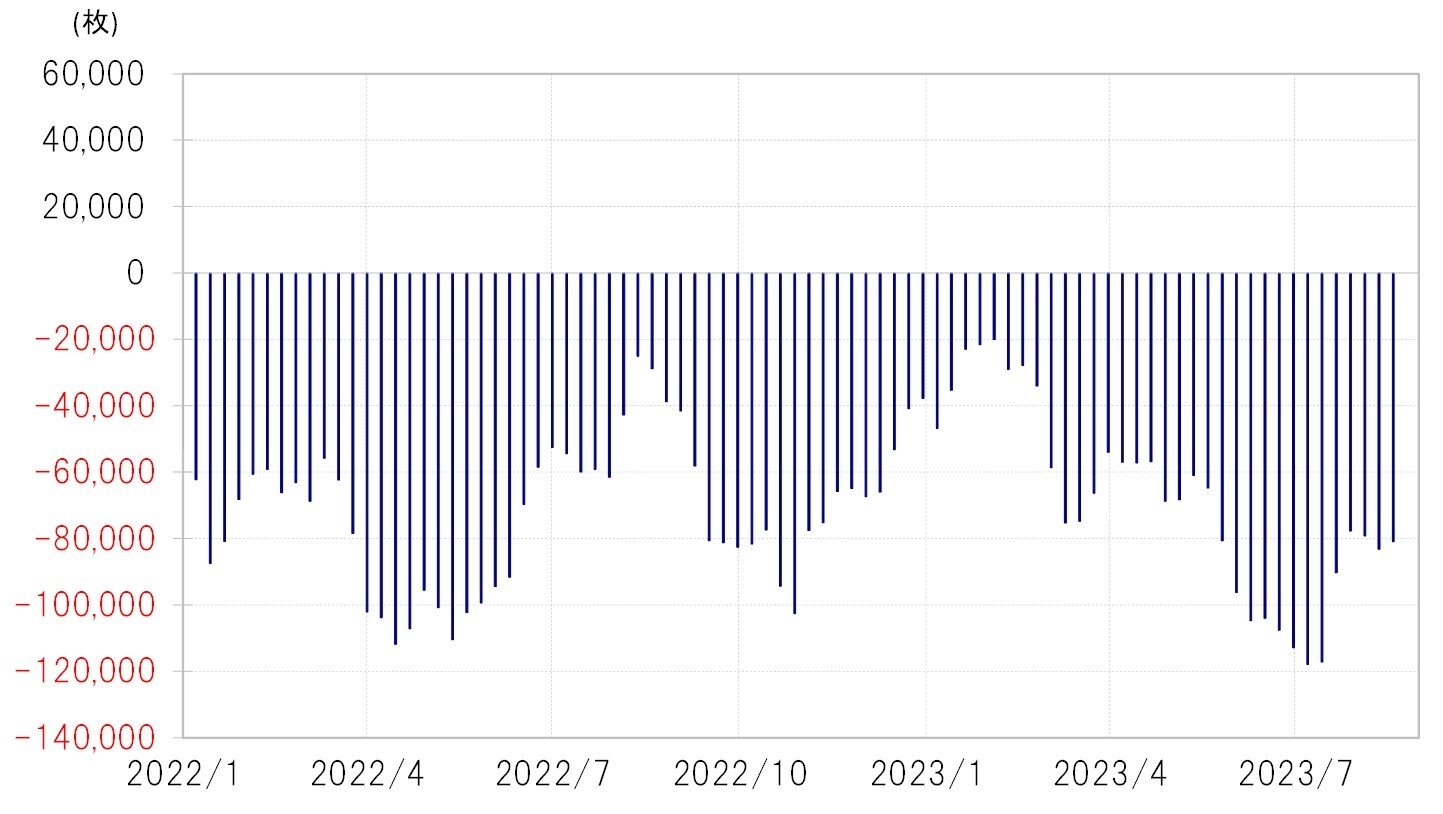 ヘッジファンド取引を反映しているとされるCFTC(米商品先物取引委員会)統計の投機筋の円ポジションは、売り越し(米ドル買い越し)が一時12万枚近くまで拡大したところは下回っているものの、先週にかけて8万枚以上に再拡大となりました(図表5参照)。経験的な円の「売られ過ぎ」の目安は10万枚程度なので、徐々にそれに迫ってきたわけです。