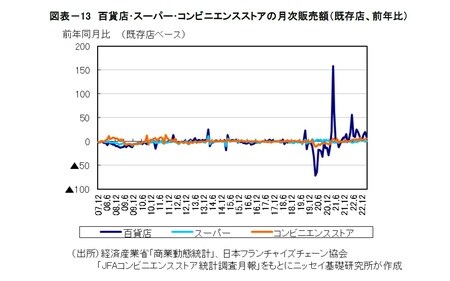 商業動態統計などによると、2023年4-6月の小売販売額(既存店、前年同期比)は百貨店が+7.5%、コンビニエンスストアが+4.5%、スーパーが+2.9%となった(図表-13)。6月単月では、百貨店が+7.2%(16カ月連続プラス)、コンビニエンスストアが+3.2%(16カ月連続プラス)、スーパーが+2.9%(9カ月連続プラス)となっている。