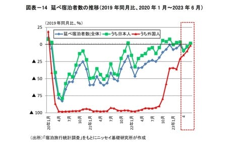 宿泊旅行統計調査によると、2023年4-6月累計の延べ宿泊者数は2019年対比で▲4.6%の水準まで回復し、このうち日本人が▲3.4%、外国人が▲9.4%となった(図表-14)。また、STR社によると、6月のホテルRevPARは2019年対比で全国が+5.3%、東京が+14.3%、大阪が▲5.6%となった。