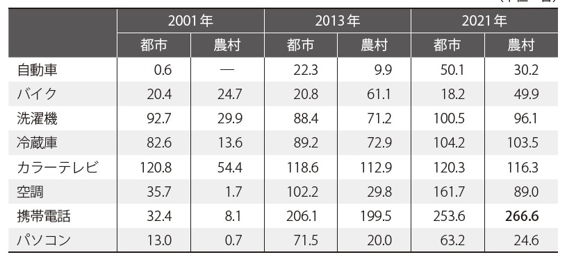 2001年と比べると、2021年には家電製品や車、携帯電話などにおける開きが明らかに縮小しています。とりわけ、農村部における携帯電話の普及ぶりが突出しており、100世帯における所有台数は都市部よりも多くなっています。これは農村部のデジタル化進展を可能にする重要な武器と言っても良いでしょう。