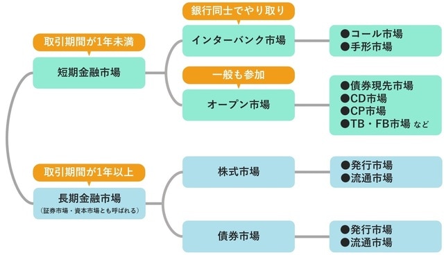 金融市場は、満期までの期間が1年未満の短期金融市場と、1年以上の長期金融市場とに分けることができます。