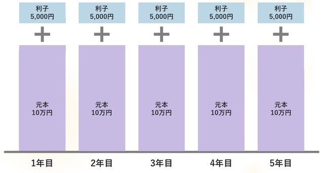 たとえば、10万円を、期間5年、利率5%の単利型商品に投資した場合、税金を無視すれば、満期時の元利合計額は、このように計算されます。