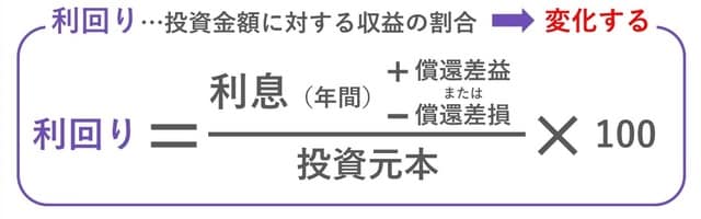 利回りとは、一定期間運用した投資元本に対して、運用期間中に得られた利息と、価格変動や売却損益の合計額の割合を、1年あたりに換算したものをいいます。