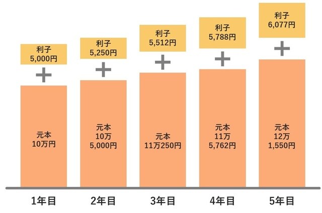 元金10万円 ×( 1 +5%)×( 1 + 5% )×( 1 + 5% )×( 1 + 5%)×( 1 + 5% )