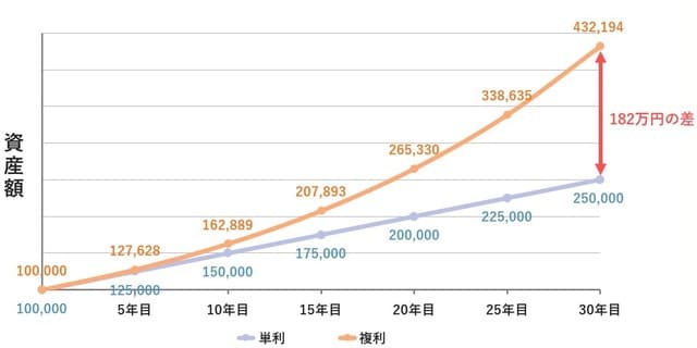 もし上記の条件で30年運用を続けた場合、元利合計額は単利が約250万円、複利が432万円と、約182万円もの差が生まれるのです。