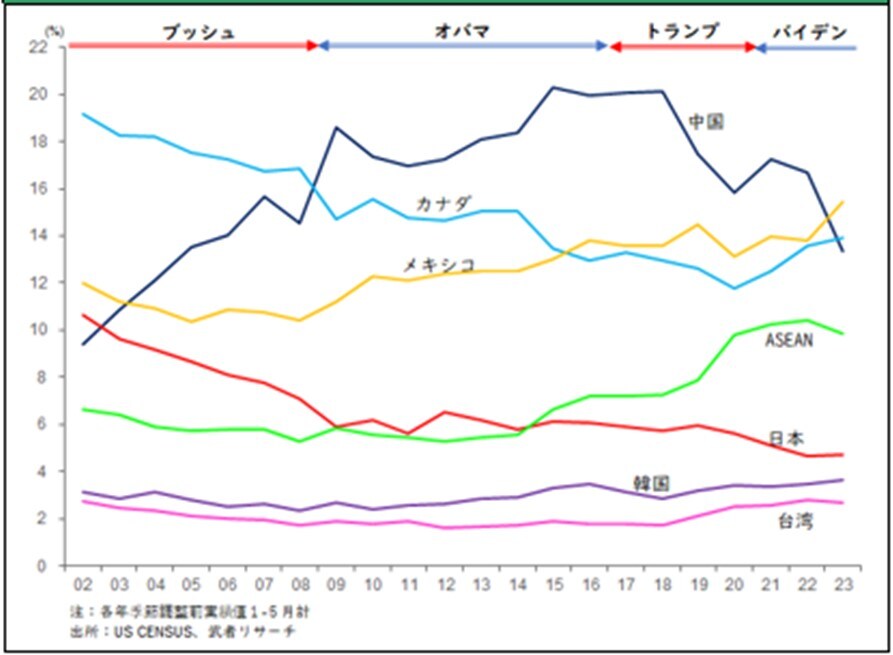 しかし今後は中国の世界シェア低下により、成長機会が他国・他地域に回帰していく。中国に機会を奪われた日本、米国、アセアン諸国、インドなどが逆転の恩恵を受けることになるだろう。それはすでに世界最大消費市場米国における中国の輸入シェアの大幅な低下に現れている[図表18]。