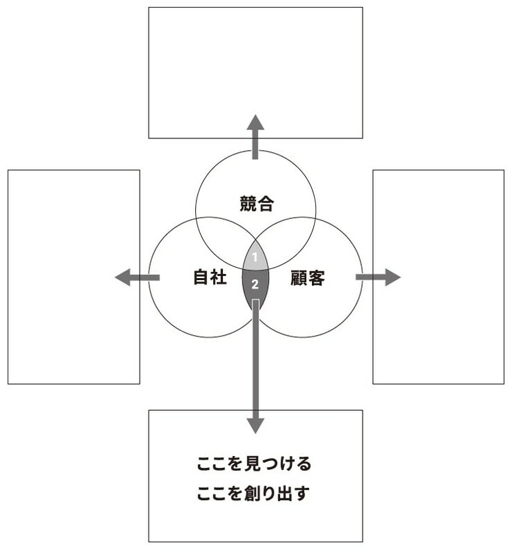 1つ目は「顧客が求めていること」「自社が提供できること」「競合が提供できないこと」を書き出す際に、先入観を持たずに、とにかくたくさんのキーワードを出すということです。最初から「2」のゾーンを探すことを目的に行なうと、思考が狭まり、チャンスを見落とすことがあるからです。