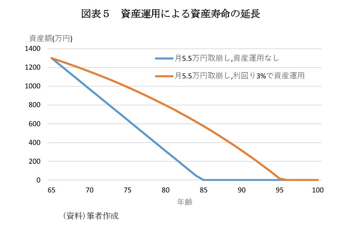 資産運用により、利益を得ていくことで取崩しの金額を減らし資産寿命5を延ばすことができる。図表5は1300万円の老後資金を毎月5.5万円ずつ取り崩す前提で資産運用を行わない場合と利回り3%で資産運用を行った場合の資金額の推移を示している。資産運用を行わない場合は85歳で資金は枯渇するが、利回り3%で資産運用を行った場合には96歳まで資産寿命を延ばすことができる。