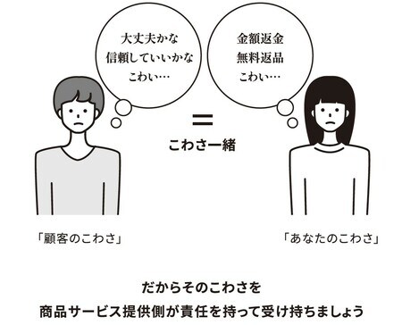 そうですよね、怖いですよね。その怖さは、顧客が買う時に感じている怖さと同じです。だからこそ、その怖さを商品サービス提供側であるあなたが引き受け、全力で顧客に対応するのです。これによって、顧客はリスクを感じなくなります。そして、あなたの商品・サービスを安心して購入してもらえるようになるのです。
