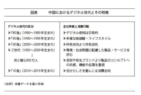 デジタル世代とひとくちに言っても、その範囲は比較的広く、世代の幅は40年以上もあります。そのため中国ではデジタル世代という表現でまとめながら、独自の区切り方によって、1980年代に生まれた人を「80後」、1990年代に生まれた人を「90後」、2000年代に生まれた人を「00後」、2010年代に生まれた人を「10後」と呼んでいます。つまり10年ごとに世代交代が進むとの考えです(図表2)。