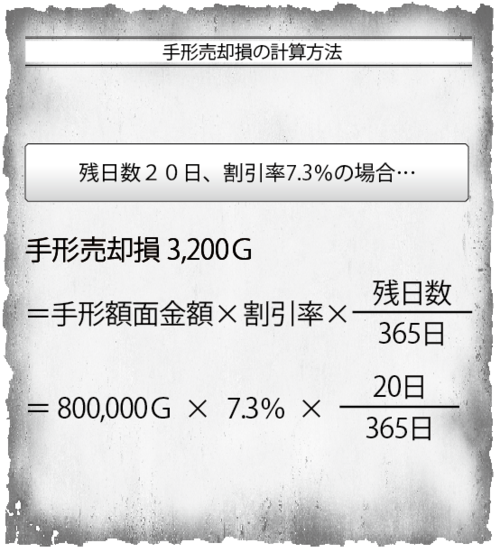 窓口「では、手形を拝見します。額面金額80万G、支払期日まで20日間ですね。この場合、手数料は──」