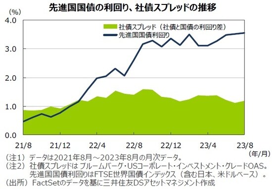 米国の10年国債利回り(長期金利)は、根強いインフレ圧力や米国債の需給悪化懸念により月初から上昇しました。堅調な米景気を示す経済指標の発表が相次ぐなか、FRBによる金融引き締めが長期化するとの観測から一時4.3%台まで上昇しました。しかし、月下旬に開催された「ジャクソンホール会議」で、パウエルFRB議長が従来のデータ重視の考えを強調したことを受け、長期金利は低下に転じ、月末は4.1%割れで終了しました。ドイツの長期金利は、ユーロ圏の景況感の悪化を受けて、小幅に低下しました。日本の長期金利は、米長期金利に連動して上昇しました。また、投資適格社債については、株式市場の下落を受けて国債と社債の利回り格差が拡大しました。