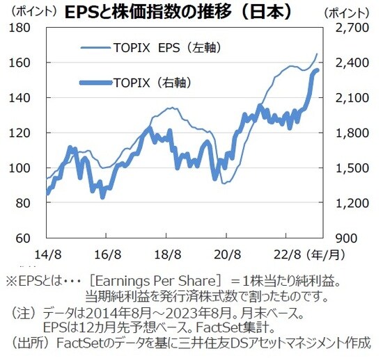S&P500種指数の8月の予想1株当たり利益(EPS)は239.7で、前年同月比+0.8%と7ヵ月ぶりにプラスに転じました。前月比は+1.9%と7ヵ月連続のプラスでした。TOPIXの予想EPSは164.9、前年同月比は同+5.2%でした。前月比は+2.3%と5ヵ月連続のプラスでした。8月の米国株式市場は調整しました。格付け会社フィッチが米国債の格付けを引き下げたことに続き、米銀70行以上を格下げする可能性が報道されたことなどで長期金利が上昇し、また、金融引き締めの長期化が懸念されたことで米国株は押し下げられました。NYダウは前月比▲2.4%、S&P500種指数は同▲1.8%、NASDAQ総合指数は同▲2.2%でした。一方、日本株式市場は米国長期金利の上昇、米株式市場の調整に加え、YCCの柔軟化を受けて日本の長期金利が上昇したことなどが重荷となりました。日経平均株価は前月比▲1.7%、TOPIXは同+0.4%でした。