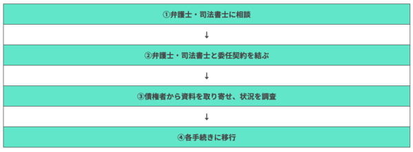 債務整理は、まずは弁護士・司法書士に相談・依頼し、借金の状況を調査したうえで、債務者に適した手続きに移行します。