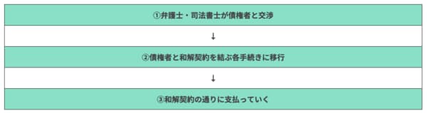 弁護士・司法書士が債権者と直接交渉します。債務者の方が債権者と交渉するということはないので、債務者は和解が終わるまで待っているだけで大丈夫です。