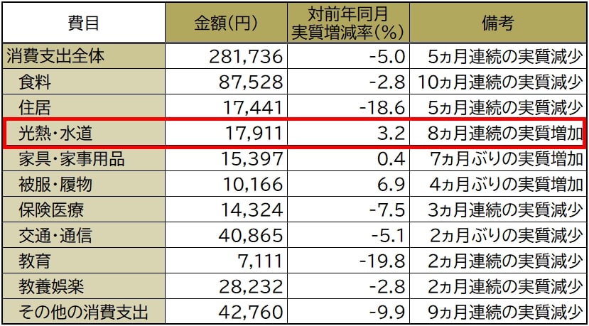 消費支出は多くの費目で「実質減少」となっていますが、そのなかで特に目を引くのが、「光熱・水道」です。2022年7月よりも3.2%増加しており、かつ、8ヵ月連続の増加です([図表1]参照)。