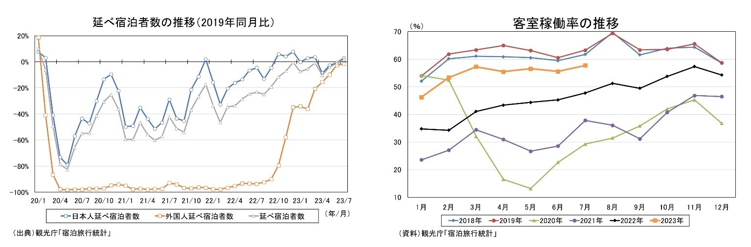 2023年7月の日本人延べ宿泊者数は4,219万人泊(6月:3,599万人泊)となり、2019年同月比は2.9%(6月:同▲0.7%)と4ヵ月ぶりにプラスに転じ、全体を押し上げた。