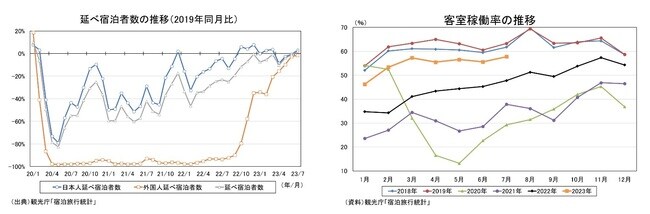 2023年7月の客室稼働率は全体で57.8%(6月:同55.6%)、2019年同月差▲5.5%(6月:同▲5.0%)と、マイナス幅が拡大した。
