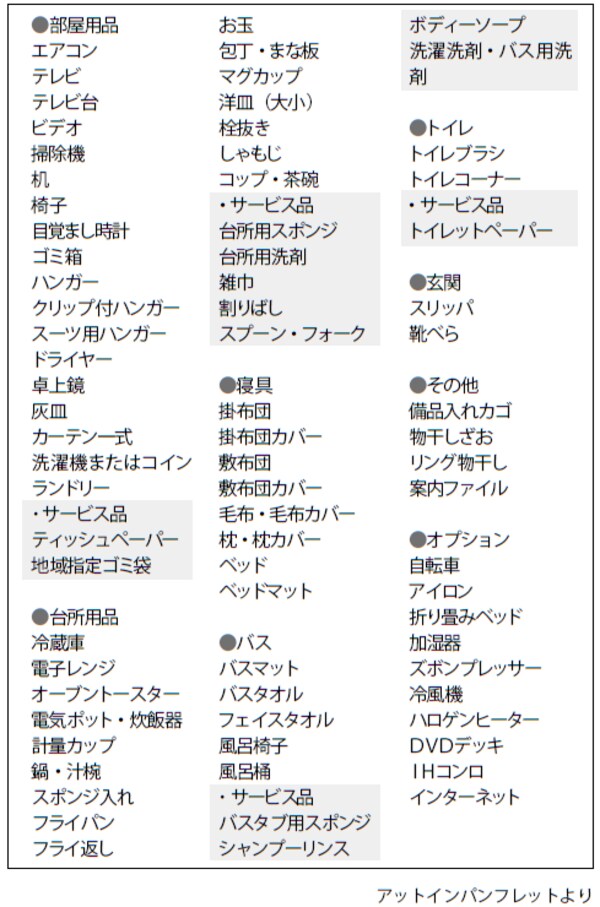 備品の多さも他社との差別化には役立っています。部屋にあらかじめ用意されている備品は60品目もあります。なかにはDVDプレーヤーのように他社ではあまり用意しない品も含まれており、これが非常に高い評価につながっています。