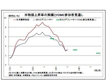 米国の物価上昇率は未だ高いものの、昨年半ば以降は概ね順調に低下基調を辿っている。コロナ禍による供給制約が解消したうえ、これまでの利上げの効果が浸透してきたためと考えられる。従って、FRBは今年11月初旬で利上げを打ち止めにする可能性が高いとみている。