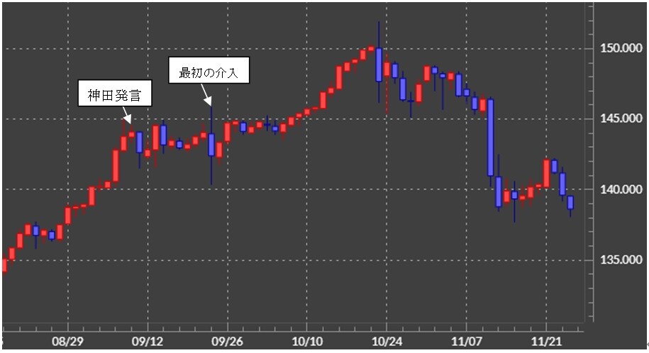 三者会合後の神田財務官の発言から2週間後、為替介入実行
