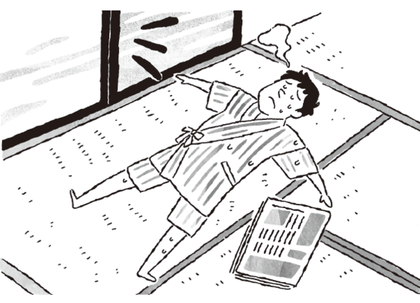 着た時にはぱりっと肌に心地よかった綿の甚平が汗で湿っぽい。むっとしたまま、お父さんは新聞を読むのもやめ、やるせない気持ちで畳の上に大の字に。「俺ののんびりとした休日を返せ!」