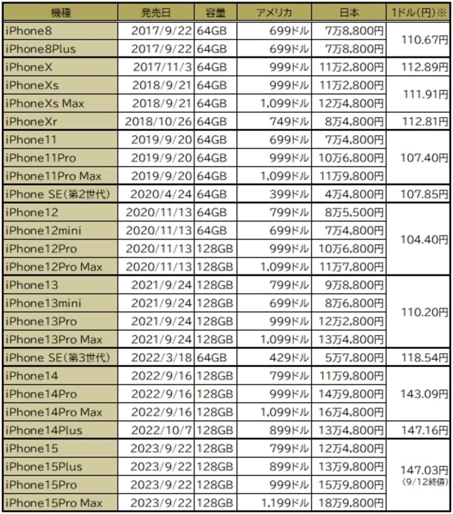 アメリカでの価格をみると、2019年9月発売の「iPhone11」は699ドルで、2020年11月発売の「iPhone12」は799ドルと、100ドル値上がりしています。その後、2021年9月発売の「iPhone13」、2022年9月発売の「iPhone14」、そして2023年9月発売の「iPhone15」と、799ドルのまま据え置かれています。