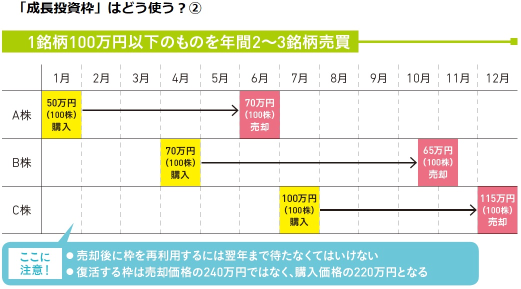 フジコ先生:また、復活するのはあくまで購入時の価格(簿価(ぼか))であることにも注意しましょう。先ほどの図表5の例だと、A株は50万円で購入して70万円で売却していますが、この場合、翌年に復活するのは売却価格の70万円ではなく、購入価格の50万円の枠ということになります。このルールは、株式だけではなく、投資信託など他の商品でも同じです。