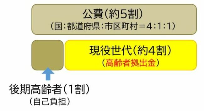 75歳以上の後期高齢者の多くは、その他の世代の人よりも医療費がかかり、かつ、所得が低くなってしまいます。そこで、医療費の自己負担額を1割に抑え、あとは国と現役世代が支援するということです。この、現役世代の健康保険から後期高齢者医療制度への支援金が「高齢者拠出金」です。