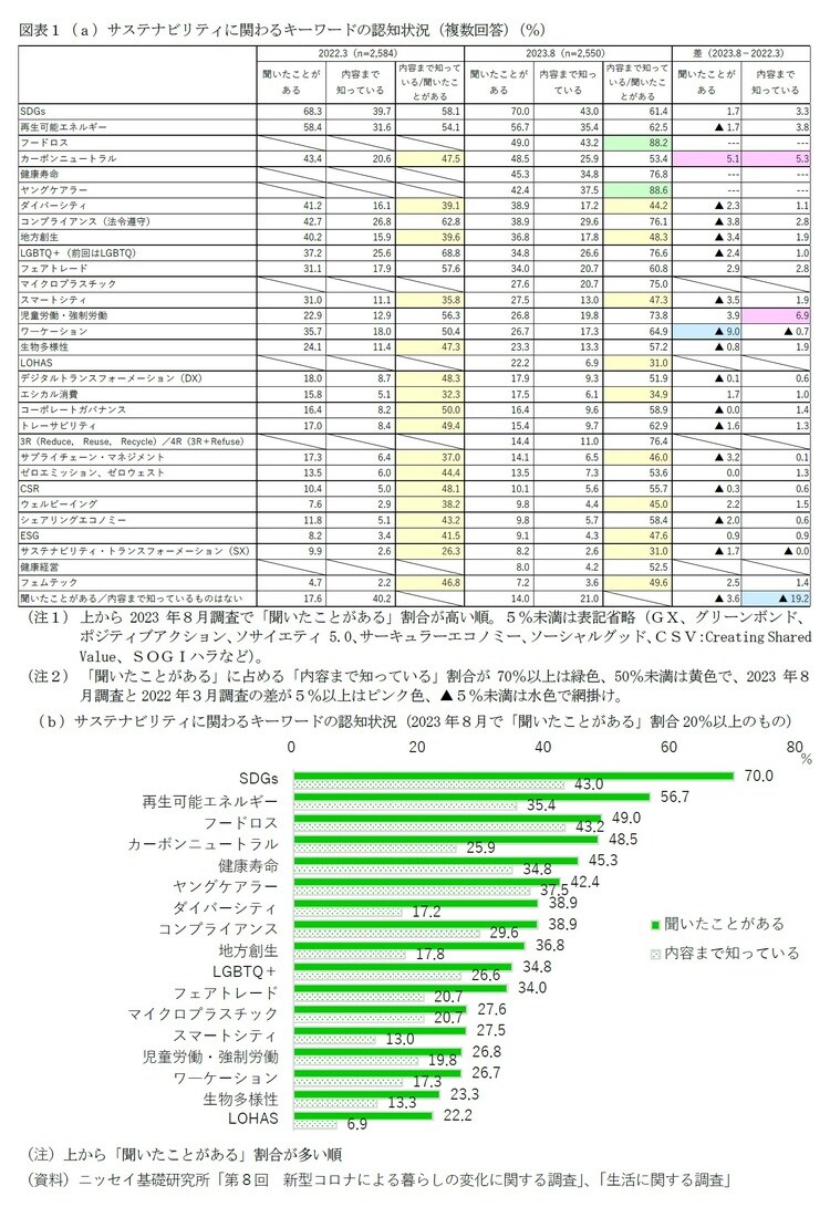 1|全体の状況~1位「SDGs」70.0%、2位「再生可能エネルギー」56.7%だが、内容まで理解は半数以下