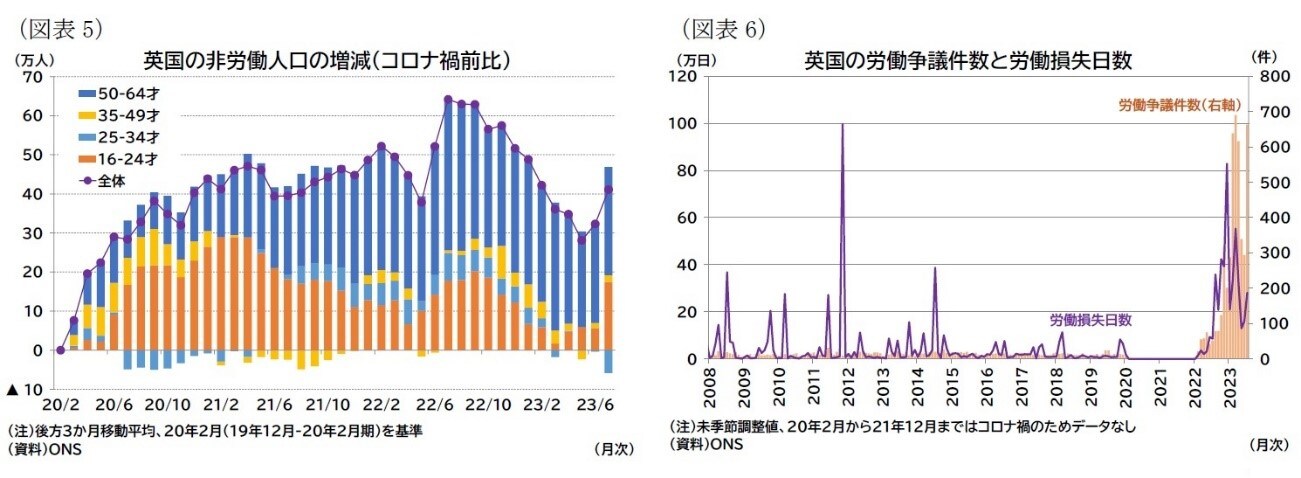 7月までのデータ(労働力調査)では、失業率が4.3%にやや上昇した。就業者の減少が続く一方で失業者と非労働力人口がともに増加した。労働参加率は5-7月期で63.5%まで低下し(コロナ禍直前ピークは64.4%、コロナ禍後のピークは63.7%)、今期は特に若年層の労働参加率の低下が目立つ(図表5)。